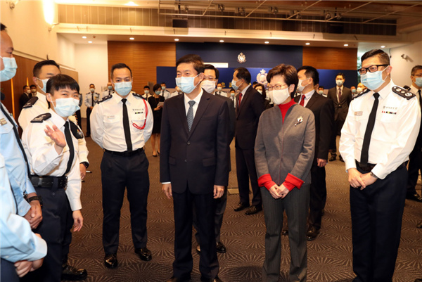 骆惠宁、林郑月娥看望香港警队人员。图片来源:新华社