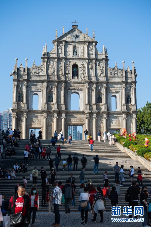 2月15日,人们在澳门大三巴牌坊前地游览。新华社记者 张金加 摄