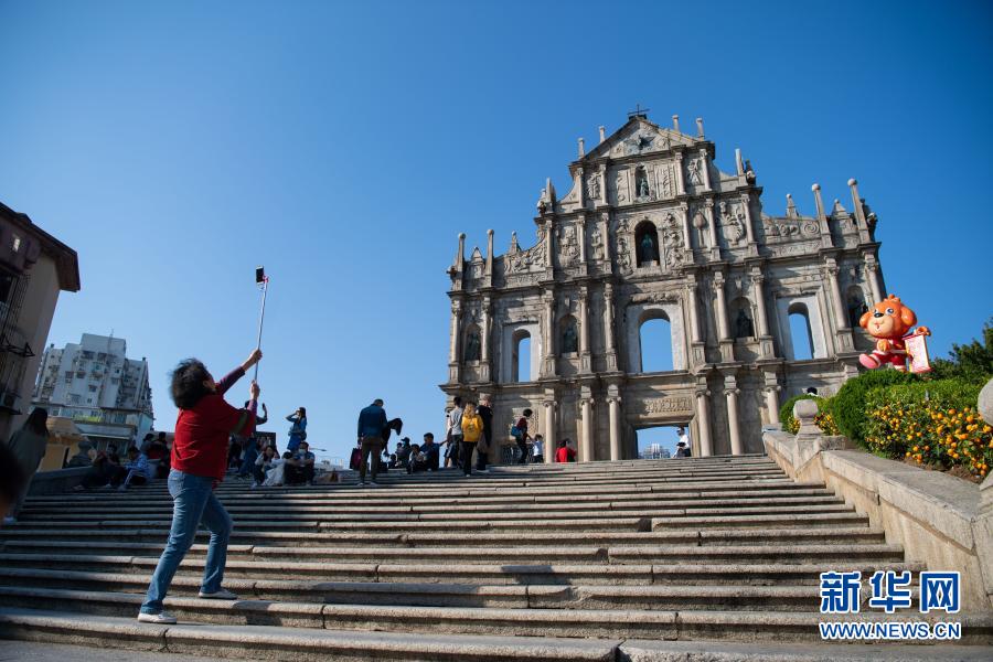 2月15日,人们在澳门大三巴牌坊前地游览。新华社记者 张金加 摄