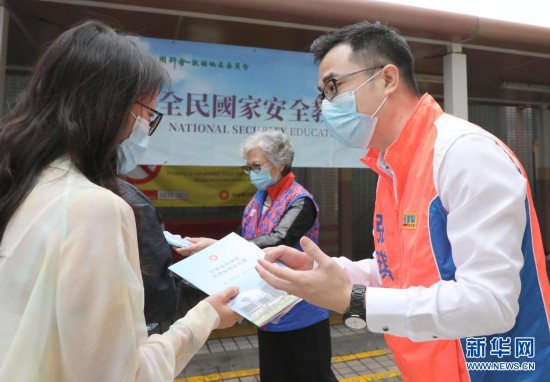 4月15日,香港市民张琪腾(右)在全民国家安全教育日活动上宣讲国家安全理念。