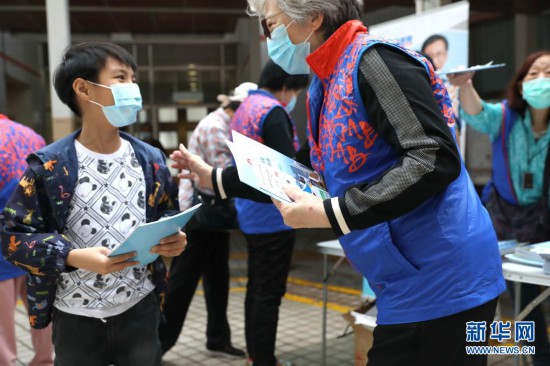 4月15日,香港鲤鱼门村摆街站的一名义工给小朋友发放国家安全教育相关材料。