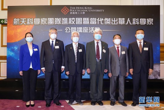 6月23日,在香港理工大学,6位航天专家(自左至右:张熇、谢军、龙乐豪、戚发轫、胡浩、孙泽洲)在讲座前留影。新华社记者 王申 摄