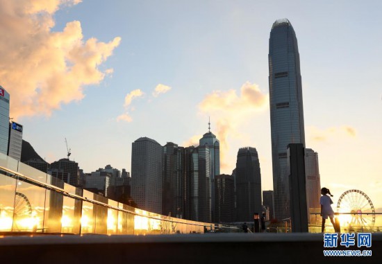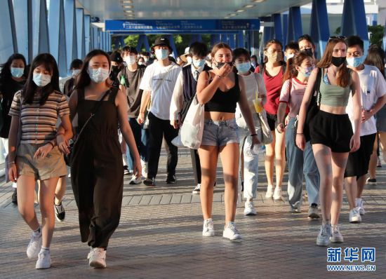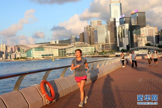 7月8日拍摄的香港中环海滨长廊上的行人。新华社记者 吴晓初 摄