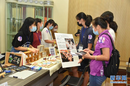 8月14日,在虎豹乐圃大厅里,几名来自博爱医院八十周年邓英喜中学的学生向参观者介绍其作品。新华社记者 陈珮盈 摄