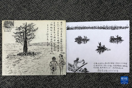 60多岁的香港市民郭永鑫在解放战争渡江战役《我送亲人过大江》的照片前驻足良久。擅长绘画的他掏出纸笔,对着照片花了半小时勾画出一副钢笔素描。在塞罕坝今昔对比照前,他用心画下了那棵“功勋树”。他把这两幅素描送给展览工作人员留念。