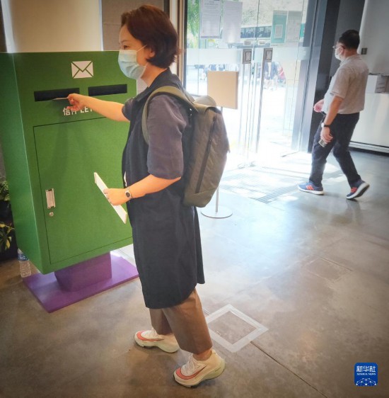 一名香港市民在参观展览后将写有留言的明信片投入现场邮筒(10月11日摄)。新华社发(伍嘉林 摄)