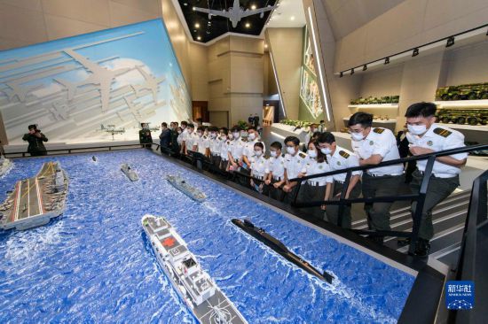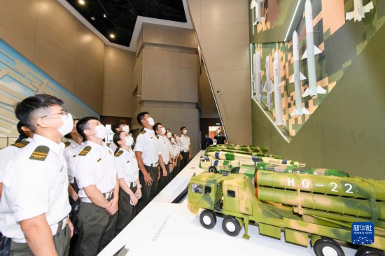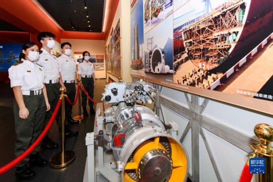 团员在驻港部队代表的带领下参观以“梦起东方”为主题的展览,观赏三个主题展厅和装备模型展示区内的展品,包括各式各样的图文展板、文物实物、场景雕塑、导览视频和解放军装备的模型。