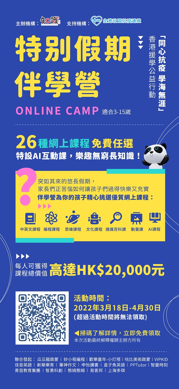 本次公益行动得到香港中联办教科部和全港小区抗疫联机的大力支持,并由香港教育工作者联会、教育评议会、新界校长会、九龙地域校长联会、香港港岛校长联会以及十八区家长教师会联会等超过40家教育专业机构和家长团体支持协办。3月18日至4月30日,参与者用手机扫描公益行动海报二维码即可免费领取相应课程。