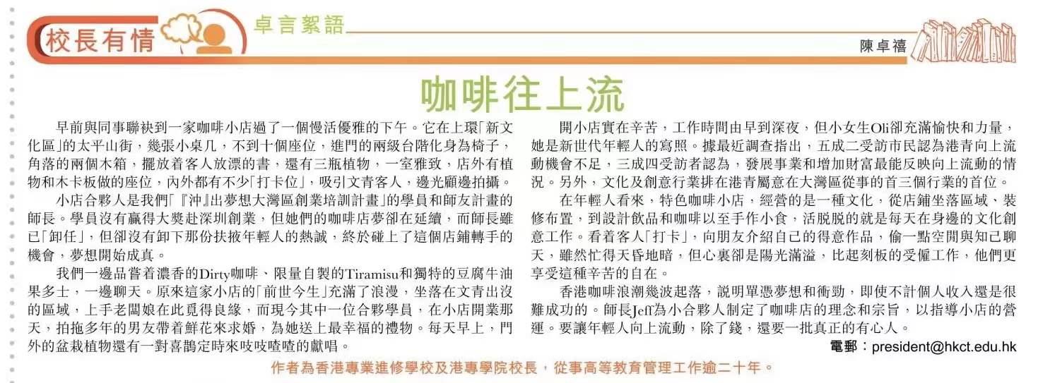 担任校长前,陈卓禧曾经做了多年的记者,如今,他仍在香港的报章开有专栏。前不久的一篇文章,叫《咖啡往上流》,写了他拜访的一间咖啡小店,“虽然忙得天昏地暗,心里却是阳光满溢”。