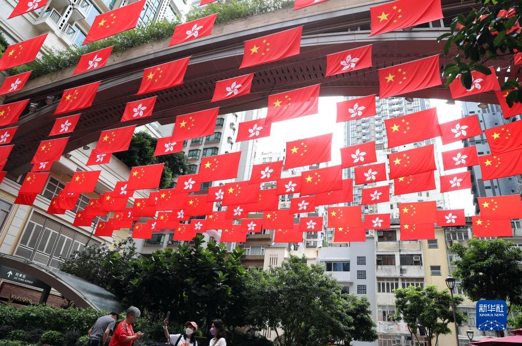 在香港利东街,中华人民共和国国旗和香港特别行政区区旗迎风飘扬(6月16日摄)。新华社记者 李钢 摄