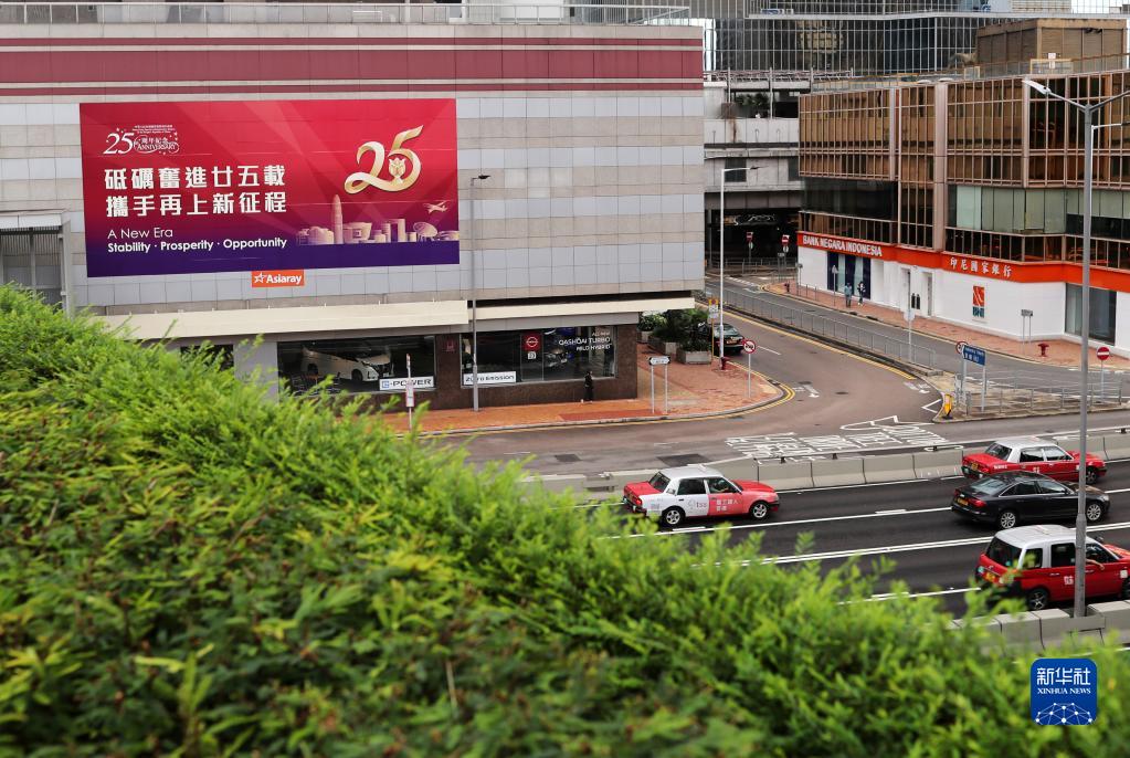 在香港街头拍摄的庆祝海报(6月14日摄)。新华社记者 李钢 摄