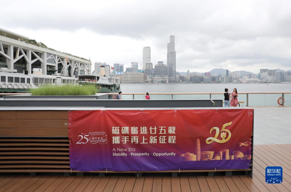 6月19日在海边拍摄的庆祝香港回归祖国25周年海报。