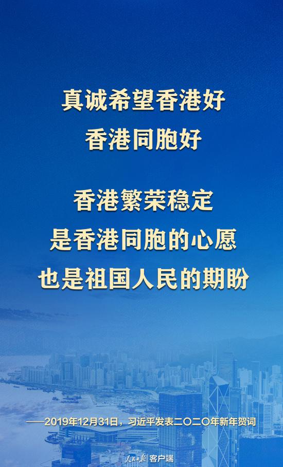 习近平主席在二〇二〇年新年贺词中强调:“真诚希望香港好、香港同胞好。香港繁荣稳定是香港同胞的心愿,也是祖国人民的期盼。”