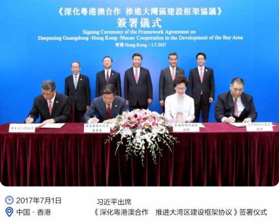 2017年7月1日上午,在习近平主席见证下,《深化粤港澳合作 推进大湾区建设框架协议》正式签署,为打造国际一流湾区和世界级城市群描绘出美好蓝图。