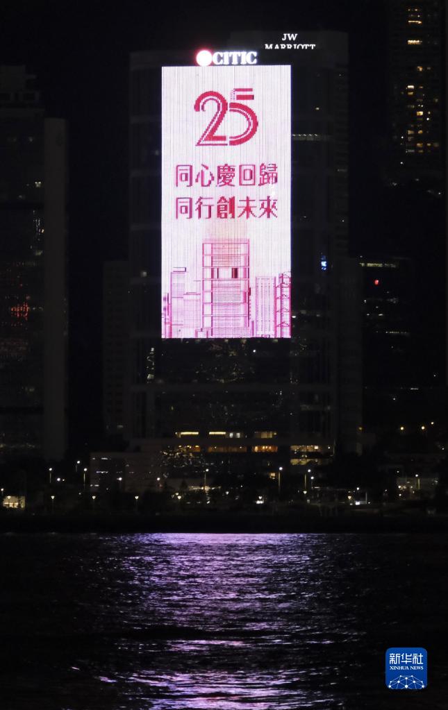 这是6月25日在香港尖沙咀拍摄的香港回归祖国25周年海报灯光秀。