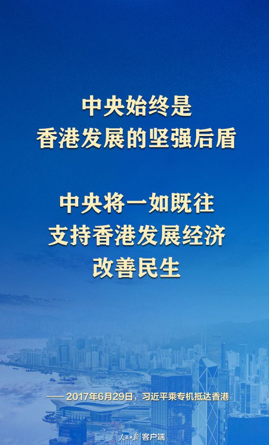 “中央始终是香港发展的坚强后盾。中央将一如既往支持香港发展经济、改善民生”。2017年6月,习近平主席时隔9年再度踏上香港。同年,党的十九大报告提出要支持香港“融入国家发展大局”。