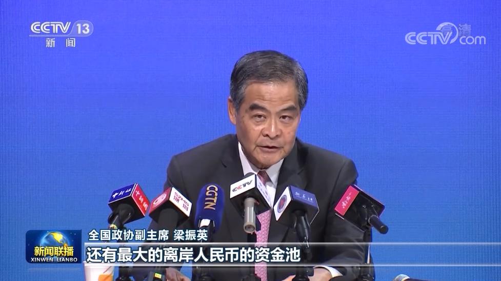 全国政协副主席 梁振英:香港作为一个国际金融、贸易中心的同时,可以发展出最大、最主要的离岸人民币市场,还有最大的离岸人民币的资金池,活生生地说明了“一国两制”是科学的、可行的,同时是有生命力的。