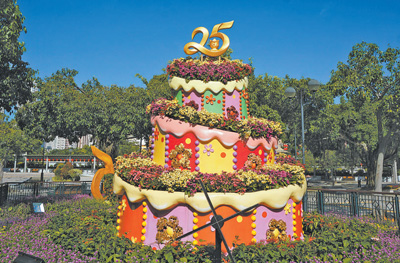 香港沙田公园,以巨型生日蛋糕为主造型的特色园圃五彩缤纷,营造庆祝香港回归祖国25周年的欢乐气氛。本报记者 裴苒迪摄