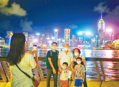 游客在香港尖沙咀的海边合影留念。本报记者 程 龙摄