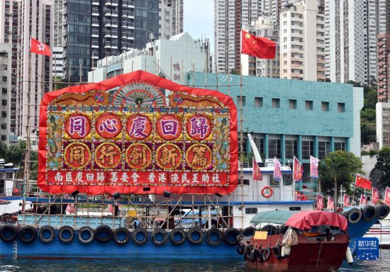 6月30日,香港仔渔船上的五星红旗和紫荆花区旗迎风飘扬。