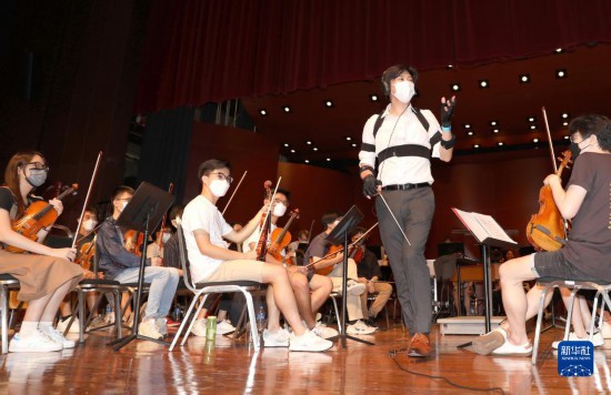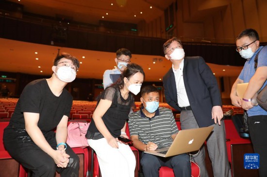 在彩排中,香港浸会大学交响乐团音乐总监潘明伦身上多处绑着传感器,他不时与台下的技术团队进行沟通(7月11日摄)。新华社记者 吴晓初 摄