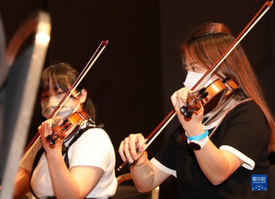 香港浸会大学交响乐团乐手在彩排中演奏(7月11日摄)。新华社记者 吴晓初 摄