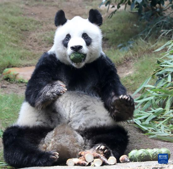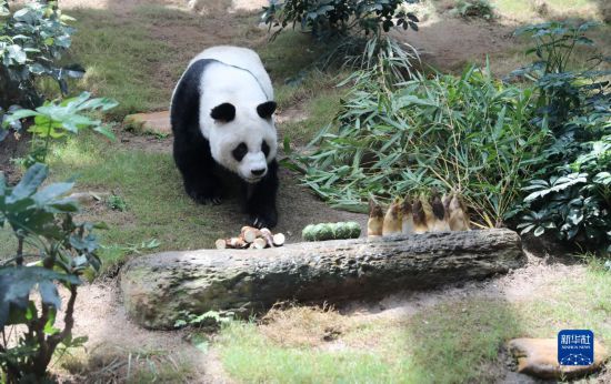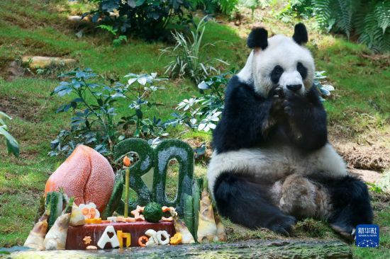 2016年8月8日拍摄的正在过30岁生日的大熊猫“安安”。新华社发(香港海洋公园供图)