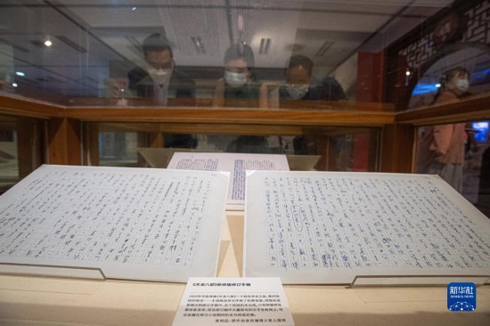 9月9日,参观者观看展出的《天龙八部》新修版修订手稿。新华社记者 肖艺九 摄