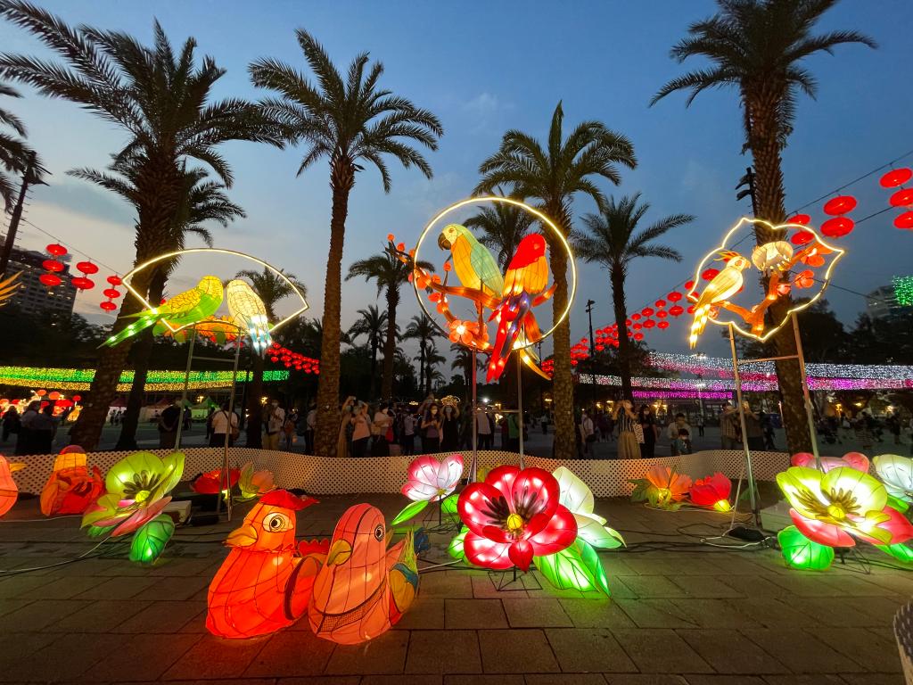 夜幕降临,香港维多利亚公园的大型灯饰逐渐亮起。高7米的中式帆船造型彩灯,还有鹦鹉、骏马、鲤鱼等多组不同主题彩灯,璀璨夺目。