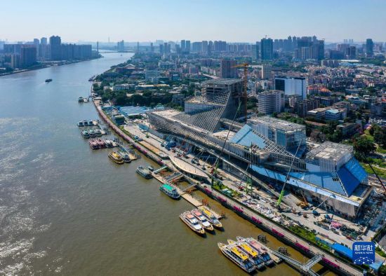 广东美术馆、广东非物质文化遗产展示中心、广东文学馆“三馆合一”建筑长350米,高近80米,宛如一艘“文化巨轮”扬帆珠江(10月12日摄,无人机照片)。