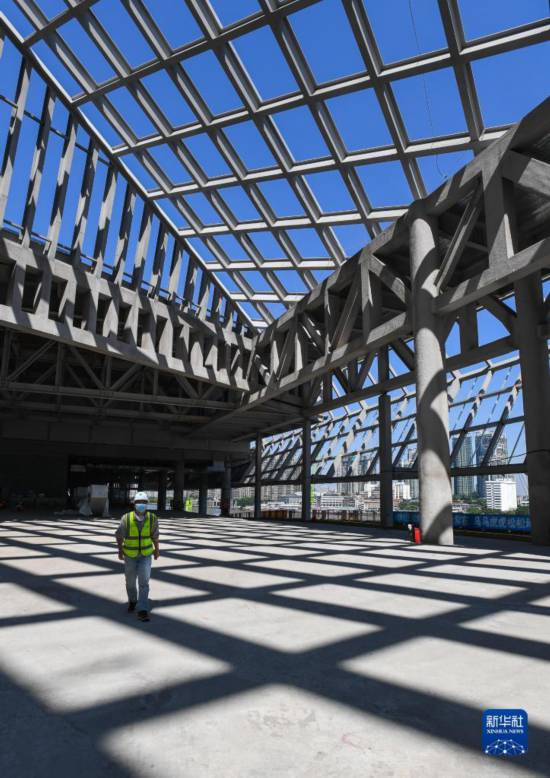 建设者经过广东美术馆、广东非物质文化遗产展示中心、广东文学馆“三馆合一”钢结构连廊(10月12日摄)。