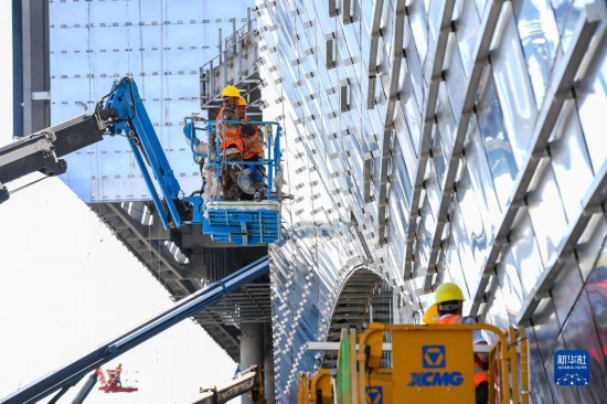 建设者在广东美术馆、广东非物质文化遗产展示中心、广东文学馆“三馆合一”项目进行幕墙施工(10月12日摄)。
