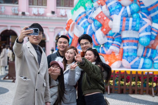 1月1日,旅客在澳门议事亭前地自拍。新华社记者 张金加 摄