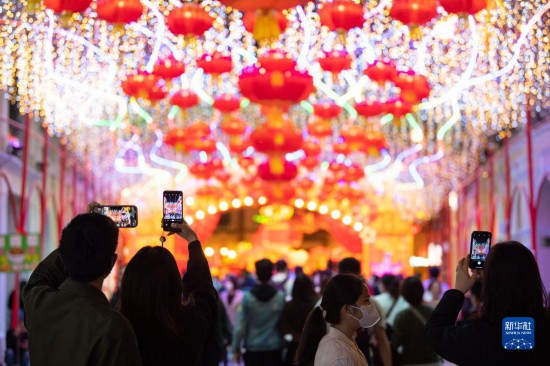 1月14日,市民在澳门议事亭前地观赏春节灯饰。