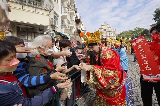 澳门特区政府旅游局局长文绮华、市政署市政管理委员会主席戴祖义、文化局局长梁惠敏、澳门贸易投资促进局代主席余雨生、旅游发展委员会委员、澳门立法会议员张健中等主持金龙和醒狮点睛仪式,在大三巴牌坊向大家拜年,并与财神、福禄寿三星、金童玉女、兔生肖及澳门旅游吉祥物“麦麦”等,向居民和旅客派送金元宝,祝愿大家福寿安康,祝福澳门繁荣兴旺。