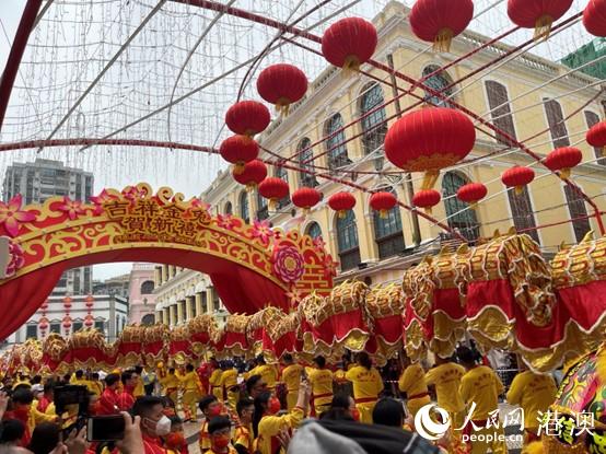 人民网澳门1月22日电 (记者富子梅)22日上午11时,农历癸卯兔年初一,在澳门地标大三巴牌坊及议事亭前地,238米长的大金龙、活泼的小狮子、灵动的生肖兔、澳门旅游吉祥物“麦麦”等,在热闹的锣鼓声中,被摩肩接踵的游客簇拥着,从大三巴牌坊出发,欢腾起舞,拉开了龙腾兔跃贺新春系列活动的首场表演。