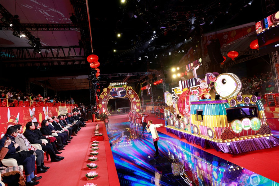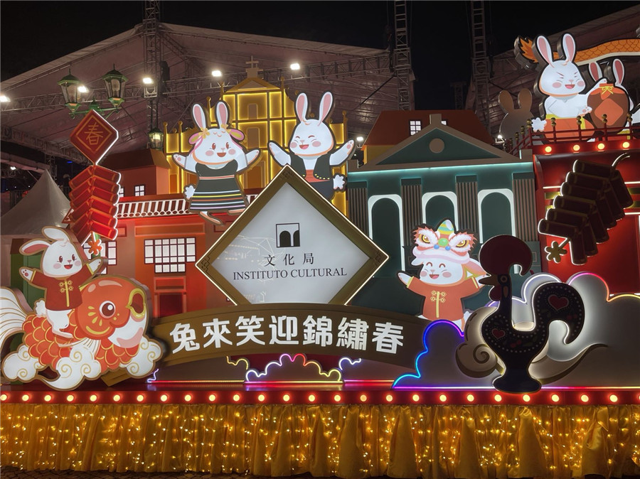 欢快的音乐,闪亮的花车,盛装的演员,兴奋的观众,汇聚成夜晚欢乐的海洋。“兔耀盛世 欢乐春节2023年农历新年花车汇演”喜庆开场。18辆花车、逾1000名演员,和着欢快的音乐依次登上400多平方米的大型LED舞台欢歌乐舞。花车由此出发,前往观音像和科学馆的巡游路线沿途表演,将澳门连成一座吉祥欢乐的不夜城。