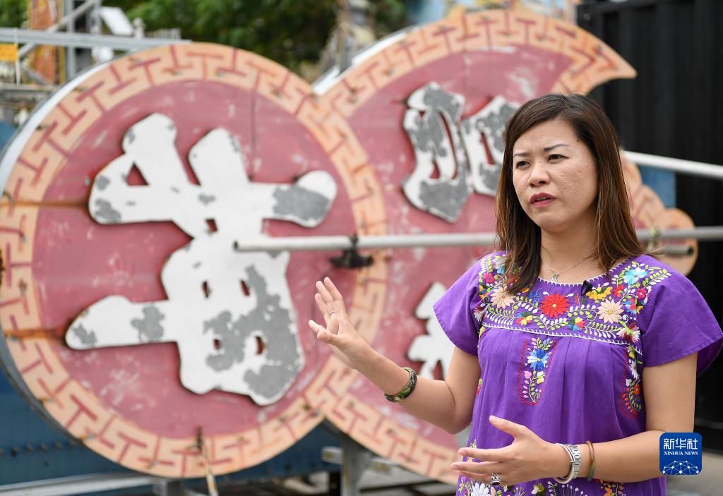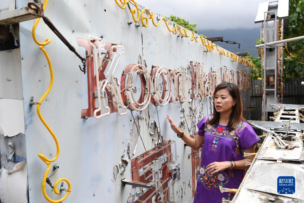 霓虹招牌保育工作者陈倩文介绍她收藏保育的霓虹招牌(3月23日摄)。新华社记者 陈铎 摄