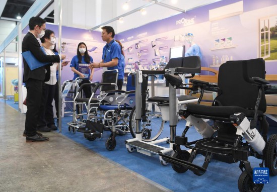 5月16日,参展商在第十四届“香港国际医疗及保健展”上介绍轮椅和升降转移椅。新华社记者 陈铎 摄