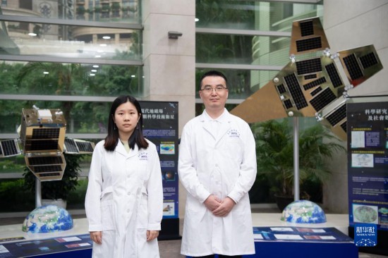 5月24日,澳科大月球与行星科学国家重点实验室博士后研究员尹亮(右)、澳科大太空科学研究所硕士研究生易思琦在澳门科技大学合影。新华社记者 张金加 摄
