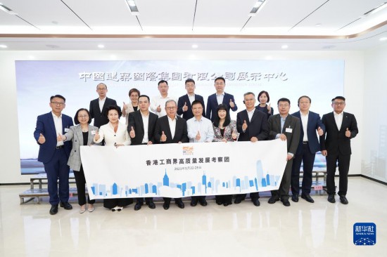 5月22日,考察团在珠海市中交汇通横琴广场前合影。新华社发