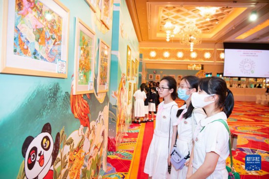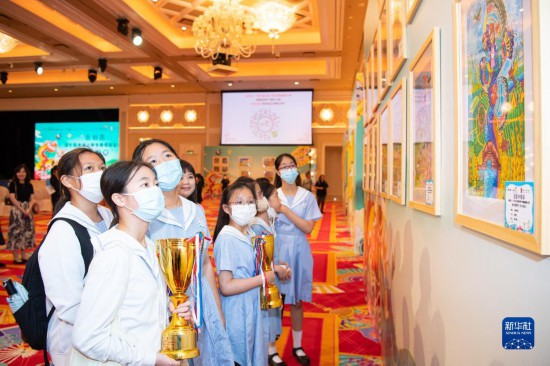 7月19日,学生观看第七届全澳小学生国情绘画大赛作品。新华社记者 张金加 摄