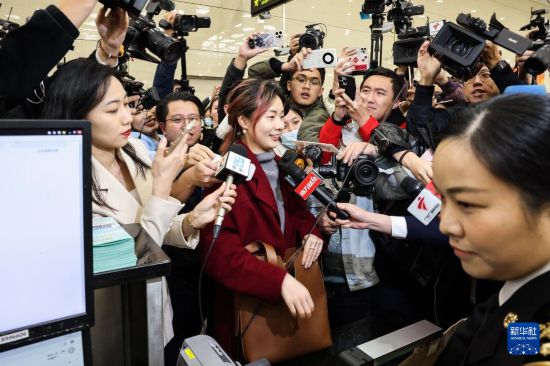 3月1日,澳门市民程曦(红衣)在横琴口岸接受媒体采访。她是横琴粤澳深度合作区正式封关运行后首位通关的旅客。新华社记者 刘大伟 摄