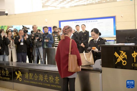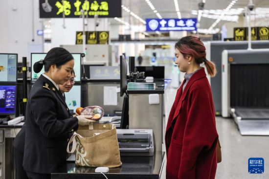 3月1日,横琴口岸海关工作人员对澳门市民程曦的行李进行查验。程曦是横琴粤澳深度合作区正式封关运行后首位通关的旅客。新华社记者 卢汉欣 摄