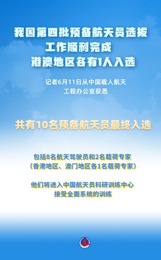 新华社北京6月11日电(李国利、杨欣)记者11日从中国载人航天工程办公室获悉,我国载人航天工程第四批预备航天员选拔工作日前结束,共有10名预备航天员最终入选,包括8名航天驾驶员和2名载荷专家(香港地区、澳门地区各1名载荷专家)。后续,他们将进入中国航天员科研训练中心接受全面系统的训练。