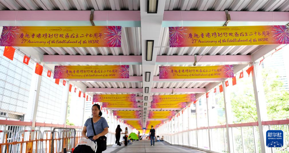 随着香港回归祖国27周年纪念日临近,香港街头悬挂国旗、区旗,张贴庆祝海报,喜庆气氛日渐浓厚。