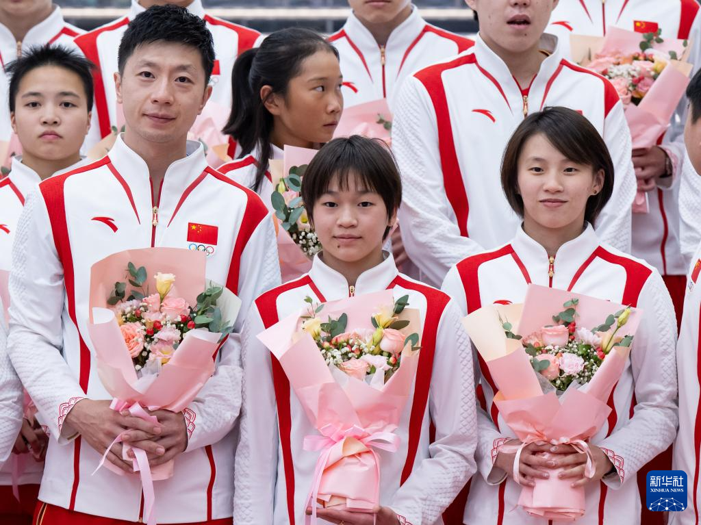 8月31日,乒乓球运动员马龙(前左)、跳水运动员全红婵(前中)、陈芋汐(前右)在欢迎仪式上。新华社记者 张金加 摄