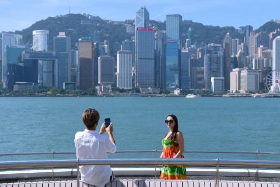 游客在香港尖沙咀拍照留念(10月3日摄)。新华社记者 陈铎 摄
