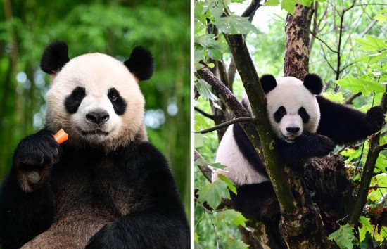 拼版照片:左为大熊猫“安安”,右为大熊猫“可可”。9月26日,第三对中央政府赠港大熊猫“安安”“可可”搭乘专机前往香港定居海洋公园。新华社发(中国大熊猫保护研究中心供图)