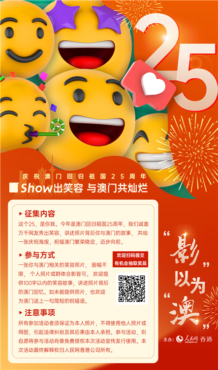 为庆祝澳门回归祖国25周年,人民网(香港)推出“影”以为“澳”笑脸征集活动,即日起至12月15日,面向广大网友征集笑容,共同祝愿“祖国好,澳门好”。